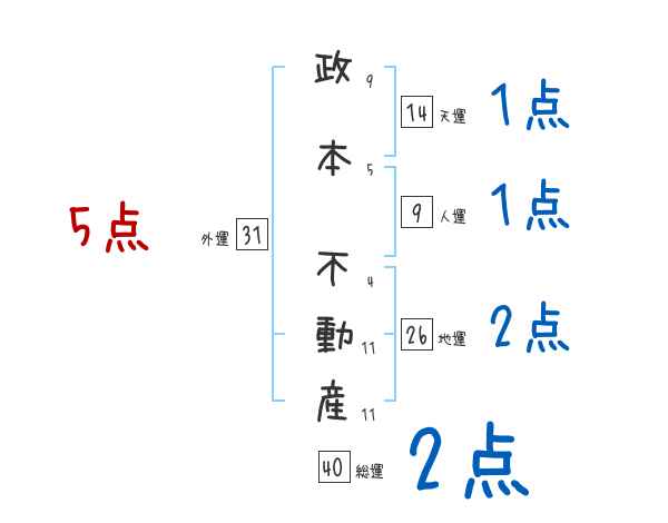 外運![]() | 政本不動産さんの外運は31画の5つ星!社交性があり判断力に優れる。順風満帆な人生で円満な生活。 生活面を象徴する運勢です。外部から受ける影響力を表し、結婚運、家庭運や職場、環境への順応性を表します。 |