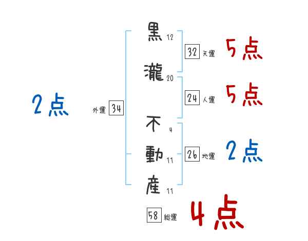 天運![]() | 黒瀧不動産さんの天運は32画の5つ星!柔軟性があり成功する。チャンスが多く金運が良い。 家系が持つ宿命的な運勢を表します。祖先から受け継いだ苗字ですので自分の力が及びません。家柄を象徴します。 |