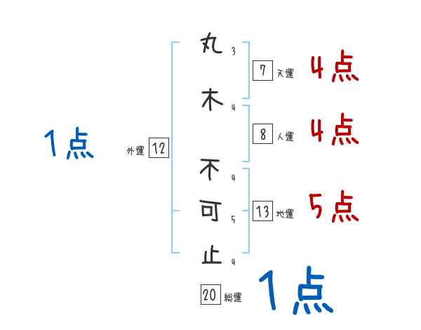 天運![]() | 丸木不可止さんの天運は7画の4つ星!強い意志や信念を持ち独立心が強い。自立する。 家系が持つ宿命的な運勢を表します。祖先から受け継いだ苗字ですので自分の力が及びません。家柄を象徴します。 |