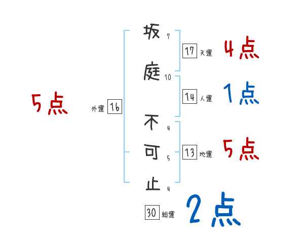 外運![]() | 坂庭不可止さんの外運は16画の5つ星!人望が厚く大きく発展する。逆転成功が見える。 生活面を象徴する運勢です。外部から受ける影響力を表し、結婚運、家庭運や職場、環境への順応性を表します。 |