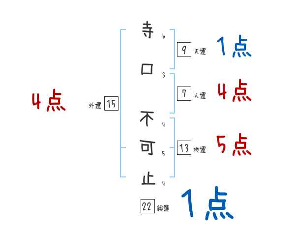 天運![]() | 寺口不可止さんの天運は9画の1つ星!消極的で才能を発揮することが苦手なことも。周りの意見に耳を傾けましょう。 家系が持つ宿命的な運勢を表します。祖先から受け継いだ苗字ですので自分の力が及びません。家柄を象徴します。 |