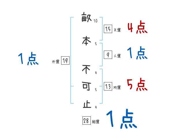 外運![]() | 畝本不可止さんの外運は19画の1つ星!優れた才能を持ちますが、協調性が足りないことも。周りの人と協力する事を意識しましょう。 生活面を象徴する運勢です。外部から受ける影響力を表し、結婚運、家庭運や職場、環境への順応性を表します。 |