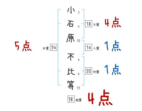 外運![]() | 小石原不比等さんの外運は24画の5つ星!家庭運が良く順調な人生。金運にも恵まれる。 生活面を象徴する運勢です。外部から受ける影響力を表し、結婚運、家庭運や職場、環境への順応性を表します。 |