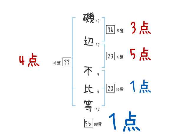 人運![]() | 磯辺不比等さんの人運は23画の5つ星!想像力に優れ活力がある。一代で成功し名誉を手に入れる。 性格や才能などを表す2番目に重要な運勢です。人間関係や協調性、社会的な成功に影響します。主に20歳から50歳ぐらいまでの中年期の運勢を表します。 |
