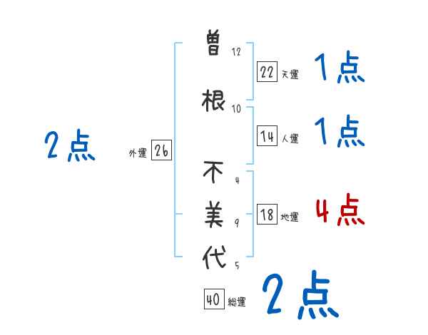 天運![]() | 曽根不美代さんの天運は22画の1つ星!努力することが苦手ないっぽう手先が器用。芸術性にも優れる。 家系が持つ宿命的な運勢を表します。祖先から受け継いだ苗字ですので自分の力が及びません。家柄を象徴します。 |