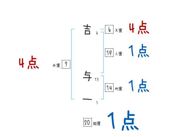 人運![]() | 吉与一さんの人運は19画の1つ星!優れた才能を持ちますが、協調性が足りないことも。周りの人と協力する事を意識しましょう。 性格や才能などを表す2番目に重要な運勢です。人間関係や協調性、社会的な成功に影響します。主に20歳から50歳ぐらいまでの中年期の運勢を表します。 |