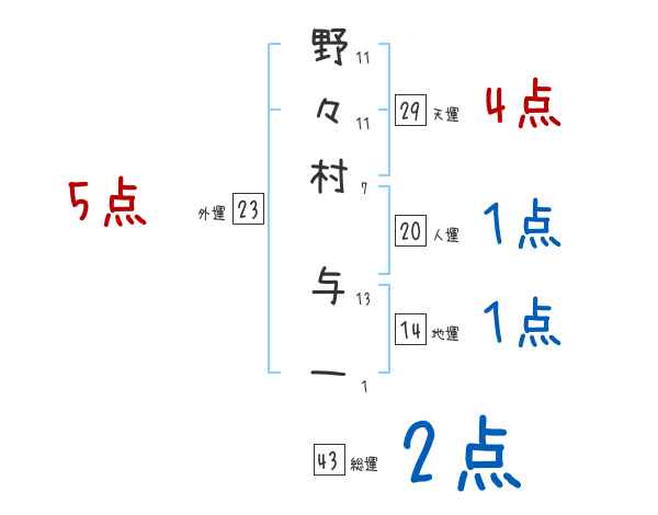 外運![]() | 野々村与一さんの外運は23画の5つ星!想像力に優れ活力がある。一代で成功し名誉を手に入れる。 生活面を象徴する運勢です。外部から受ける影響力を表し、結婚運、家庭運や職場、環境への順応性を表します。 |