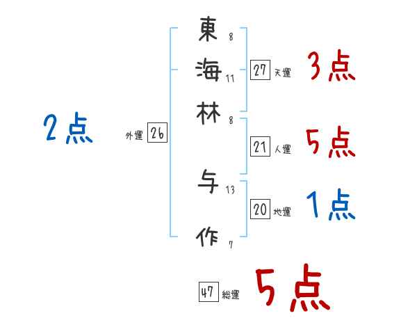 人運![]() | 東海林与作さんの人運は21画の5つ星!統率力がある。独立し成功する。名誉を手に入れる。 性格や才能などを表す2番目に重要な運勢です。人間関係や協調性、社会的な成功に影響します。主に20歳から50歳ぐらいまでの中年期の運勢を表します。 |