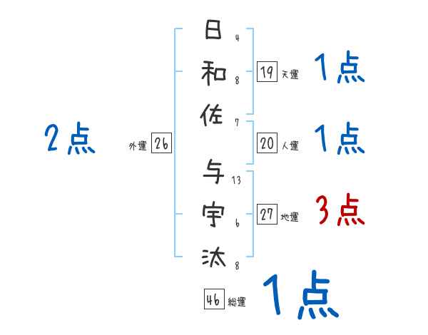 外運![]() | 日和佐与宇汰さんの外運は26画の2つ星!波瀾万丈かも。信頼できる人を大事にしましょう。 生活面を象徴する運勢です。外部から受ける影響力を表し、結婚運、家庭運や職場、環境への順応性を表します。 |