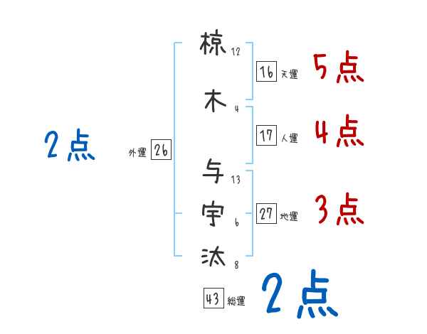 天運![]() | 椋木与宇汰さんの天運は16画の5つ星!人望が厚く大きく発展する。逆転成功が見える。 家系が持つ宿命的な運勢を表します。祖先から受け継いだ苗字ですので自分の力が及びません。家柄を象徴します。 |