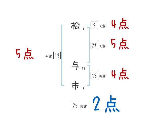 人運![]() | 松与市さんの人運は21画の5つ星!統率力がある。独立し成功する。名誉を手に入れる。 性格や才能などを表す2番目に重要な運勢です。人間関係や協調性、社会的な成功に影響します。主に20歳から50歳ぐらいまでの中年期の運勢を表します。 |