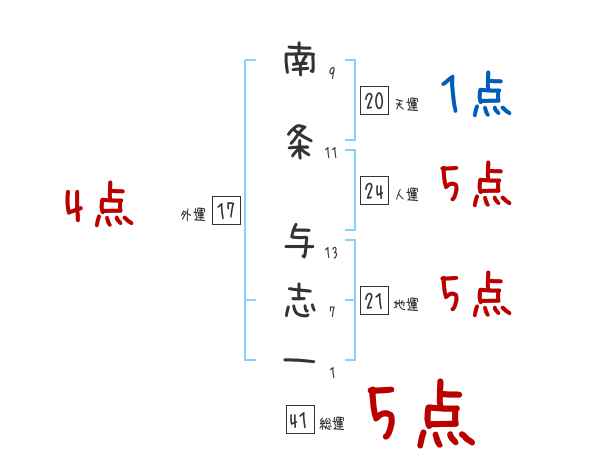 外運![]() | 南条与志一さんの外運は17画の4つ星!積極的な行動力。地位を気づき財産を手に入れる。純粋な心と直感力。 生活面を象徴する運勢です。外部から受ける影響力を表し、結婚運、家庭運や職場、環境への順応性を表します。 |