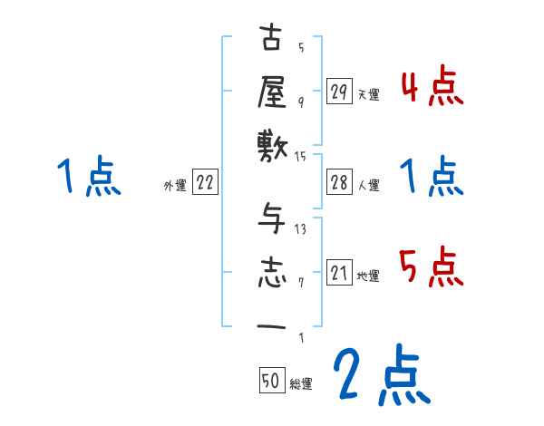 天運![]() | 古屋敷与志一さんの天運は29画の4つ星!完全主義で才能がある。厳格な心の持ち主。 家系が持つ宿命的な運勢を表します。祖先から受け継いだ苗字ですので自分の力が及びません。家柄を象徴します。 |
