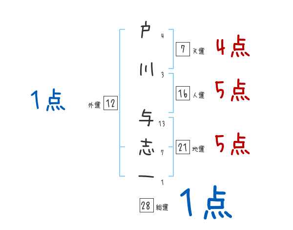 | 総運  | 戸川与志一さんの総運は28画の1つ星!家庭環境に注意。スポーツで活躍できる能力があるかも。あなたの人生を表す1番重要な運勢です。生涯を通じて影響する総合運となり、主に50歳以降の晩年期に影響を及ぼします。 |
