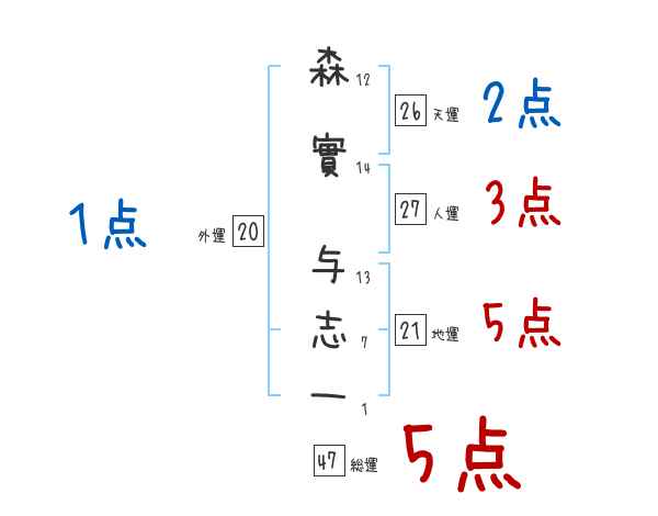 天運![]() | 森實与志一さんの天運は26画の2つ星!波瀾万丈かも。信頼できる人を大事にしましょう。 家系が持つ宿命的な運勢を表します。祖先から受け継いだ苗字ですので自分の力が及びません。家柄を象徴します。 |