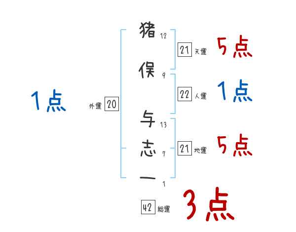 天運![]() | 猪俣与志一さんの天運は21画の5つ星!統率力がある。独立し成功する。名誉を手に入れる。 家系が持つ宿命的な運勢を表します。祖先から受け継いだ苗字ですので自分の力が及びません。家柄を象徴します。 |