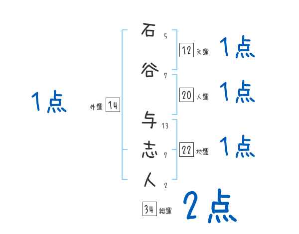 外運![]() | 石谷与志人さんの外運は14画の1つ星!人に対して優しいがストレスを溜め込みがち。人間関係のトラブルを避けるよう気をつけましょう。 生活面を象徴する運勢です。外部から受ける影響力を表し、結婚運、家庭運や職場、環境への順応性を表します。 |