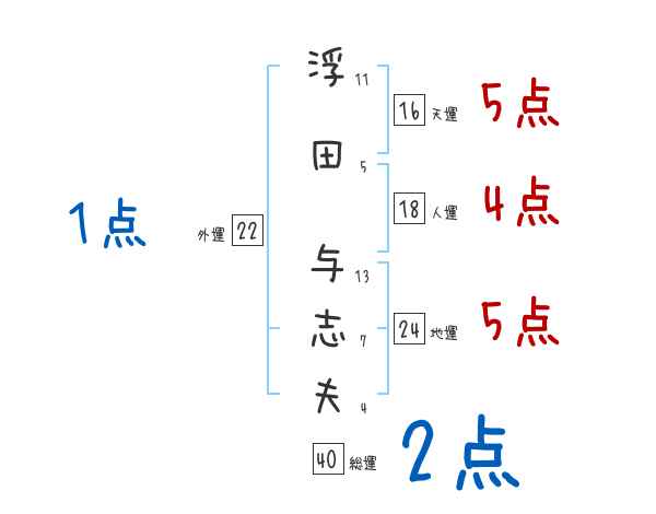 天運![]() | 浮田与志夫さんの天運は16画の5つ星!人望が厚く大きく発展する。逆転成功が見える。 家系が持つ宿命的な運勢を表します。祖先から受け継いだ苗字ですので自分の力が及びません。家柄を象徴します。 |