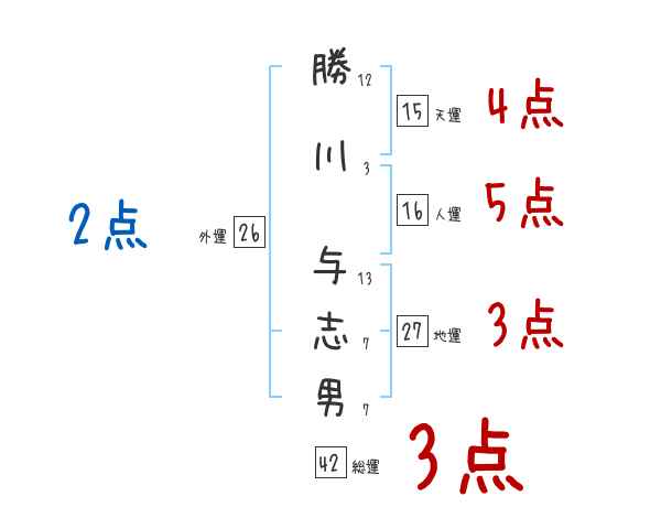人運![]() | 勝川与志男さんの人運は16画の5つ星!人望が厚く大きく発展する。逆転成功が見える。 性格や才能などを表す2番目に重要な運勢です。人間関係や協調性、社会的な成功に影響します。主に20歳から50歳ぐらいまでの中年期の運勢を表します。 |