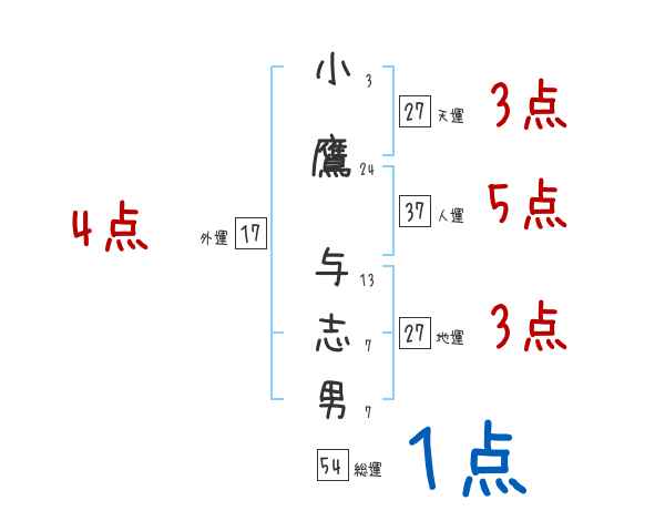 天運![]() | 小鷹与志男さんの天運は27画の3つ星!頭脳明晰だが強情で摩擦が多い傾向。孤立に注意。 家系が持つ宿命的な運勢を表します。祖先から受け継いだ苗字ですので自分の力が及びません。家柄を象徴します。 |