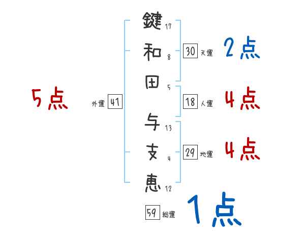 天運![]() | 鍵和田与支恵さんの天運は30画の2つ星!浮き沈みの激しさに注意しましょう。 家系が持つ宿命的な運勢を表します。祖先から受け継いだ苗字ですので自分の力が及びません。家柄を象徴します。 |