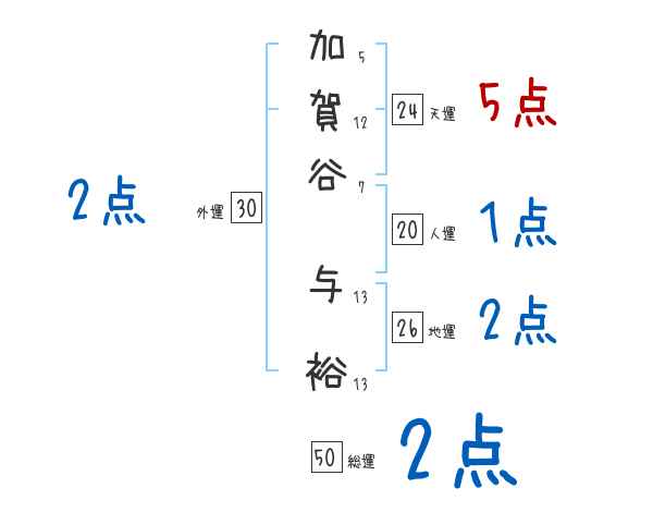 天運![]() | 加賀谷与裕さんの天運は24画の5つ星!家庭運が良く順調な人生。金運にも恵まれる。 家系が持つ宿命的な運勢を表します。祖先から受け継いだ苗字ですので自分の力が及びません。家柄を象徴します。 |