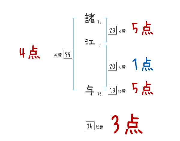 天運![]() | 諸江与さんの天運は23画の5つ星!想像力に優れ活力がある。一代で成功し名誉を手に入れる。 家系が持つ宿命的な運勢を表します。祖先から受け継いだ苗字ですので自分の力が及びません。家柄を象徴します。 |