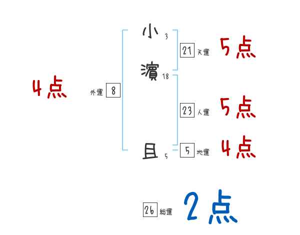 人運![]() | 小濵且さんの人運は23画の5つ星!想像力に優れ活力がある。一代で成功し名誉を手に入れる。 性格や才能などを表す2番目に重要な運勢です。人間関係や協調性、社会的な成功に影響します。主に20歳から50歳ぐらいまでの中年期の運勢を表します。 |