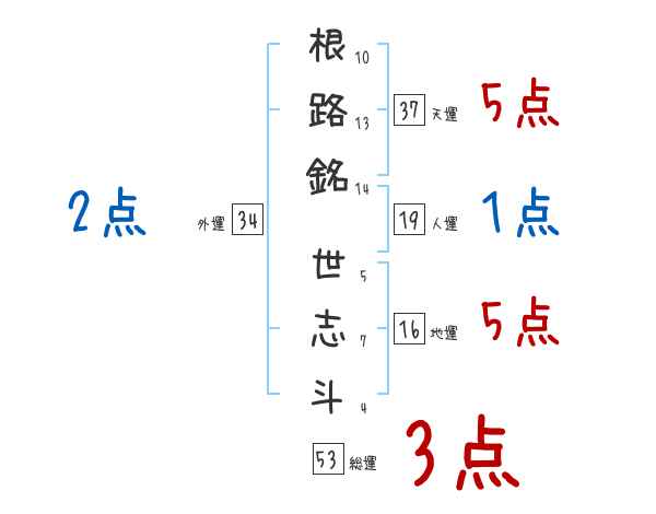 人運![]() | 根路銘世志斗さんの人運は19画の1つ星!優れた才能を持ちますが、協調性が足りないことも。周りの人と協力する事を意識しましょう。 性格や才能などを表す2番目に重要な運勢です。人間関係や協調性、社会的な成功に影響します。主に20歳から50歳ぐらいまでの中年期の運勢を表します。 |