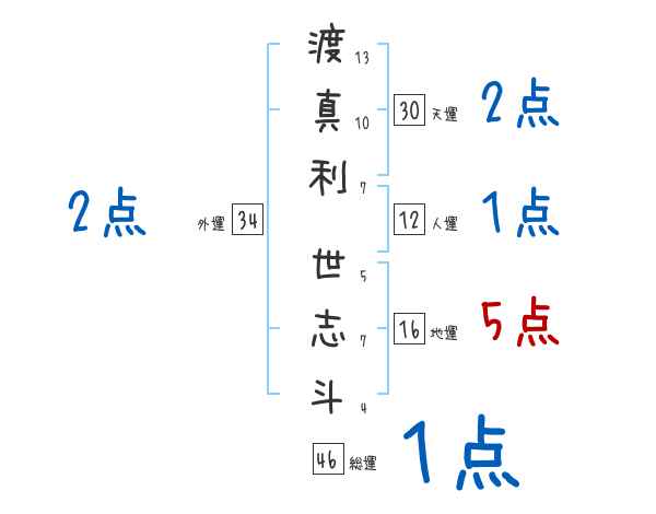 天運![]() | 渡真利世志斗さんの天運は30画の2つ星!浮き沈みの激しさに注意しましょう。 家系が持つ宿命的な運勢を表します。祖先から受け継いだ苗字ですので自分の力が及びません。家柄を象徴します。 |