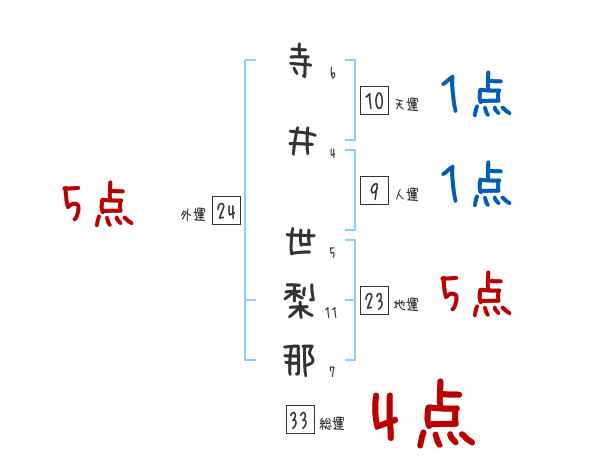 外運![]() | 寺井世梨那さんの外運は24画の5つ星!家庭運が良く順調な人生。金運にも恵まれる。 生活面を象徴する運勢です。外部から受ける影響力を表し、結婚運、家庭運や職場、環境への順応性を表します。 |