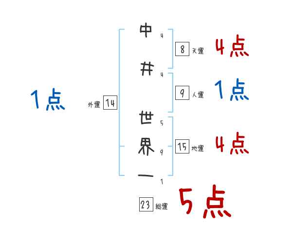 外運![]() | 中井世界一さんの外運は14画の1つ星!人に対して優しいがストレスを溜め込みがち。人間関係のトラブルを避けるよう気をつけましょう。 生活面を象徴する運勢です。外部から受ける影響力を表し、結婚運、家庭運や職場、環境への順応性を表します。 |