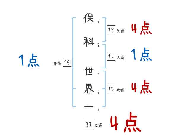 | 外運  | 保科世界一さんの外運は19画の1つ星!優れた才能を持ちますが、協調性が足りないことも。周りの人と協力する事を意識しましょう。生活面を象徴する運勢です。外部から受ける影響力を表し、結婚運、家庭運や職場、環境への順応性を表します。 |