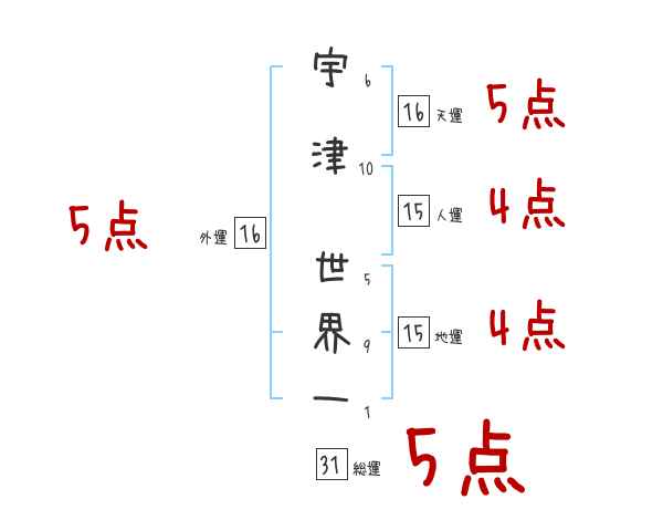外運![]() | 宇津世界一さんの外運は16画の5つ星!人望が厚く大きく発展する。逆転成功が見える。 生活面を象徴する運勢です。外部から受ける影響力を表し、結婚運、家庭運や職場、環境への順応性を表します。 |