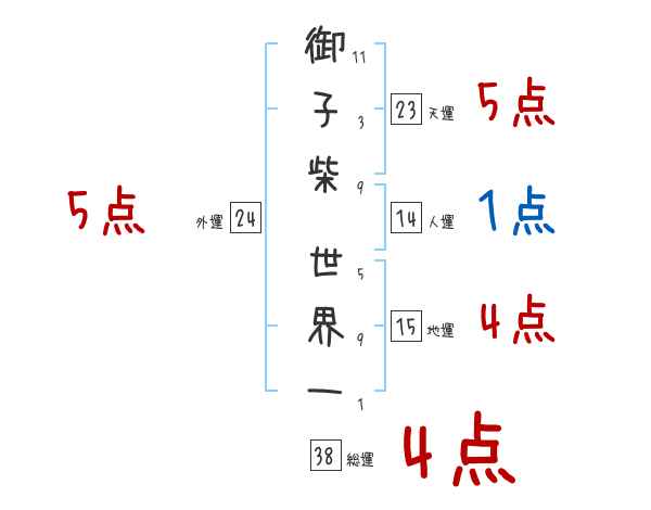 天運![]() | 御子柴世界一さんの天運は23画の5つ星!想像力に優れ活力がある。一代で成功し名誉を手に入れる。 家系が持つ宿命的な運勢を表します。祖先から受け継いだ苗字ですので自分の力が及びません。家柄を象徴します。 |