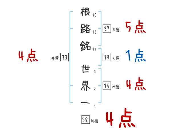 総運![]() | 根路銘世界一さんの総運は52画の4つ星!先見性と独創性に優れ考える力がある。強運の持ち主。 あなたの人生を表す1番重要な運勢です。生涯を通じて影響する総合運となり、主に50歳以降の晩年期に影響を及ぼします。 |