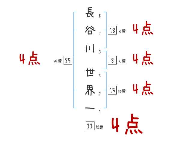 天運![]() | 長谷川世界一さんの天運は18画の4つ星!情熱的で剛気。忍耐力があり信頼される。 家系が持つ宿命的な運勢を表します。祖先から受け継いだ苗字ですので自分の力が及びません。家柄を象徴します。 |