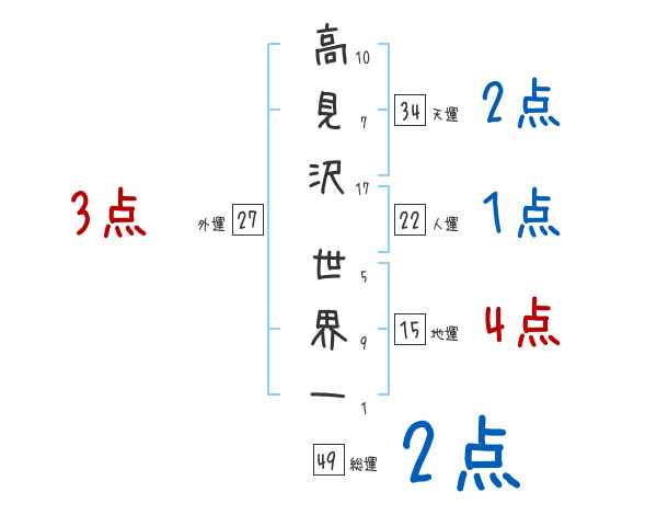 外運![]() | 高見沢世界一さんの外運は27画の3つ星!頭脳明晰だが強情で摩擦が多い傾向。孤立に注意。 生活面を象徴する運勢です。外部から受ける影響力を表し、結婚運、家庭運や職場、環境への順応性を表します。 |