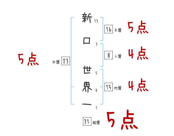 天運![]() | 新口世界一さんの天運は16画の5つ星!人望が厚く大きく発展する。逆転成功が見える。 家系が持つ宿命的な運勢を表します。祖先から受け継いだ苗字ですので自分の力が及びません。家柄を象徴します。 |