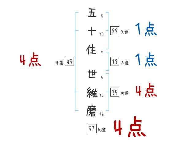 外運![]() | 五十住世維磨さんの外運は45画の4つ星!もくもくと物事を進め達成する。地味な努力家。 生活面を象徴する運勢です。外部から受ける影響力を表し、結婚運、家庭運や職場、環境への順応性を表します。 |