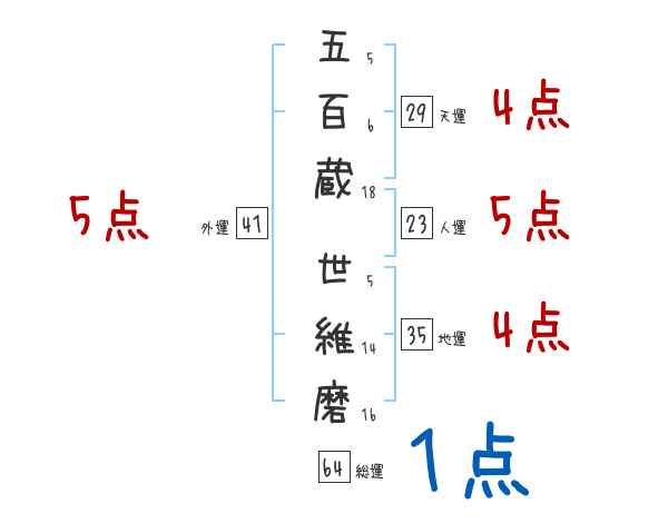 人運![]() | 五百蔵世維磨さんの人運は23画の5つ星!想像力に優れ活力がある。一代で成功し名誉を手に入れる。 性格や才能などを表す2番目に重要な運勢です。人間関係や協調性、社会的な成功に影響します。主に20歳から50歳ぐらいまでの中年期の運勢を表します。 |