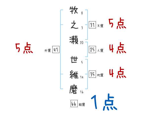 総運![]() | 牧之瀬世維磨さんの総運は66画の1つ星!迷うことが多く挫折しやすい傾向が。辛抱強く物事に取り組みましょう。 あなたの人生を表す1番重要な運勢です。生涯を通じて影響する総合運となり、主に50歳以降の晩年期に影響を及ぼします。 |