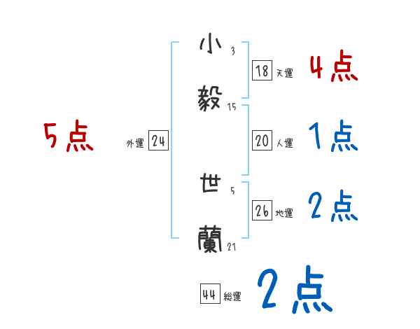 外運![]() | 小毅世蘭さんの外運は24画の5つ星!家庭運が良く順調な人生。金運にも恵まれる。 生活面を象徴する運勢です。外部から受ける影響力を表し、結婚運、家庭運や職場、環境への順応性を表します。 |