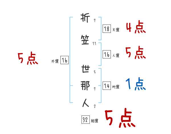 人運![]() | 折笠世那人さんの人運は16画の5つ星!人望が厚く大きく発展する。逆転成功が見える。 性格や才能などを表す2番目に重要な運勢です。人間関係や協調性、社会的な成功に影響します。主に20歳から50歳ぐらいまでの中年期の運勢を表します。 |