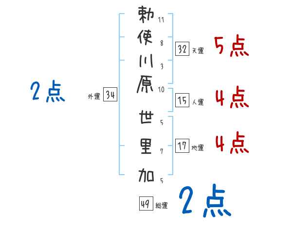 天運![]() | 勅使川原世里加さんの天運は32画の5つ星!柔軟性があり成功する。チャンスが多く金運が良い。 家系が持つ宿命的な運勢を表します。祖先から受け継いだ苗字ですので自分の力が及びません。家柄を象徴します。 |