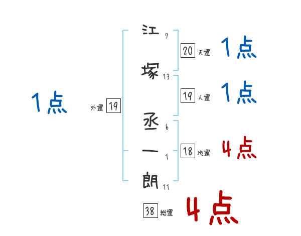 外運![]() | 江塚丞一朗さんの外運は19画の1つ星!優れた才能を持ちますが、協調性が足りないことも。周りの人と協力する事を意識しましょう。 生活面を象徴する運勢です。外部から受ける影響力を表し、結婚運、家庭運や職場、環境への順応性を表します。 |