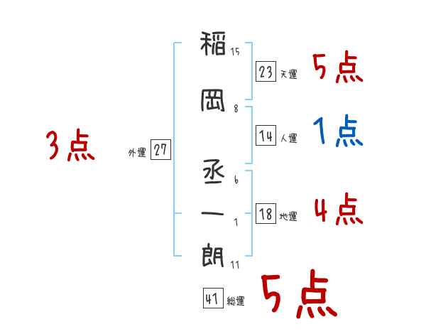 天運![]() | 稲岡丞一朗さんの天運は23画の5つ星!想像力に優れ活力がある。一代で成功し名誉を手に入れる。 家系が持つ宿命的な運勢を表します。祖先から受け継いだ苗字ですので自分の力が及びません。家柄を象徴します。 |