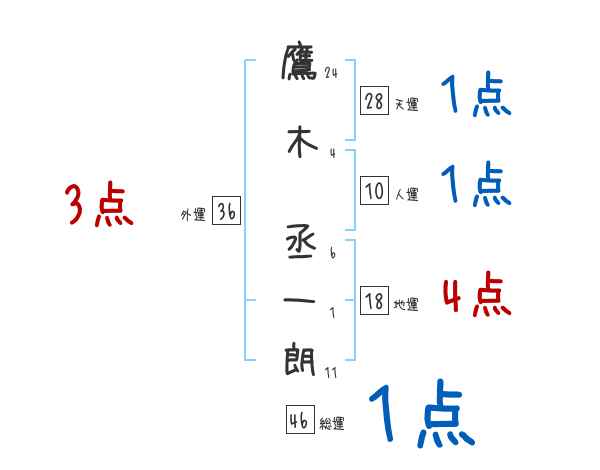 天運![]() | 鷹木丞一朗さんの天運は28画の1つ星!家庭環境に注意。スポーツで活躍できる能力があるかも。 家系が持つ宿命的な運勢を表します。祖先から受け継いだ苗字ですので自分の力が及びません。家柄を象徴します。 |