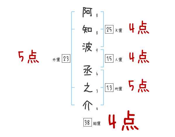 外運![]() | 阿知波丞之介さんの外運は23画の5つ星!想像力に優れ活力がある。一代で成功し名誉を手に入れる。 生活面を象徴する運勢です。外部から受ける影響力を表し、結婚運、家庭運や職場、環境への順応性を表します。 |