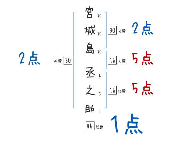 天運![]() | 宮城島丞之助さんの天運は30画の2つ星!浮き沈みの激しさに注意しましょう。 家系が持つ宿命的な運勢を表します。祖先から受け継いだ苗字ですので自分の力が及びません。家柄を象徴します。 |